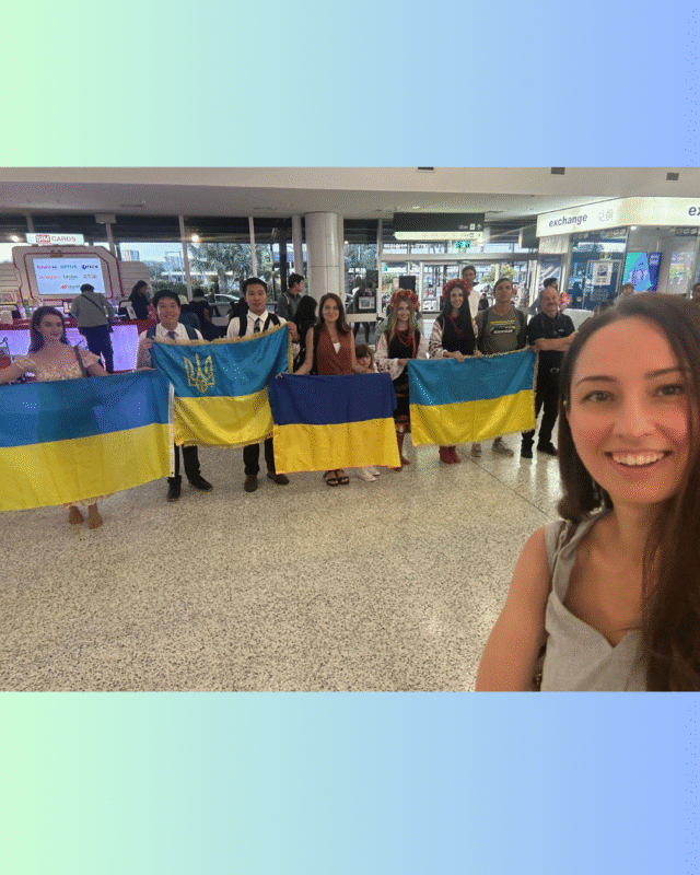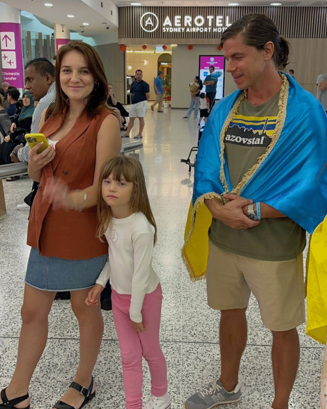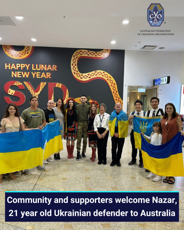 Ukrainians and supporters welcome Nazar “Kapa”, a young Ukrainian defender, to Australia for innovative surgery in Sydney!