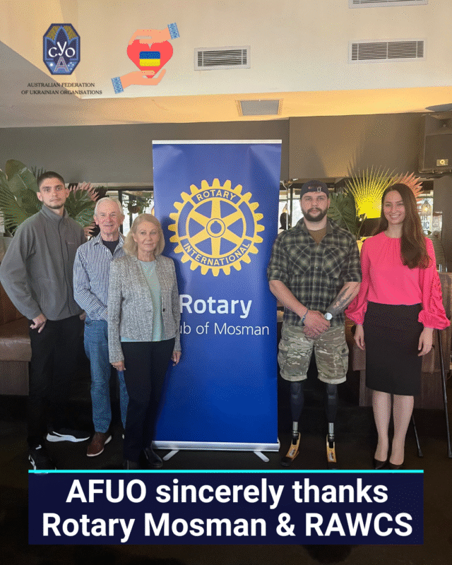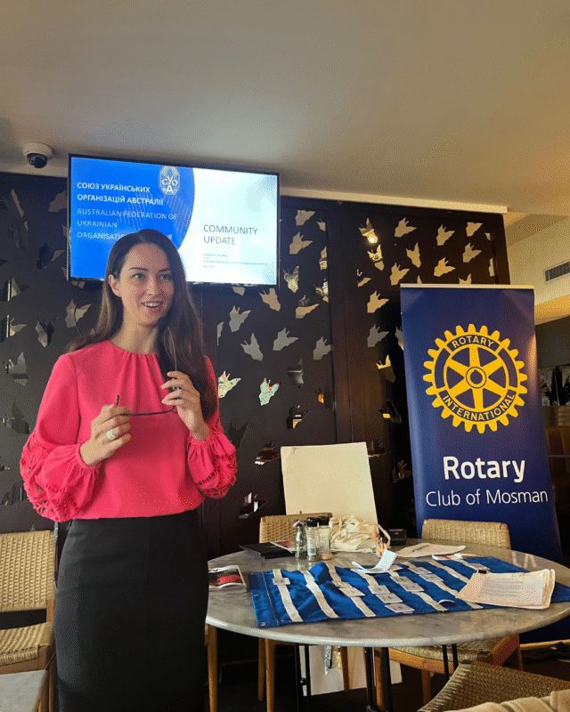 Last week, Australian Federation of Ukrainian Organisations (AFUO) Chair Kateryna Argyrou and AFUO Humanitarian & Medical Aid Director Diahanna Senko were welcomed to the Rotary Mosman club to update their supportive members of the current situation in Ukraine and the tremendous impact their generous donations have made in Ukraine through Ukraine Crisis Appeal, Defend Ukraine Appeal & Future Ukraine. To the members of Rotary Mosman — your incredibly generous $5,500 donation, creatively raised through a Mother’s Day raffle, has made a profound difference!