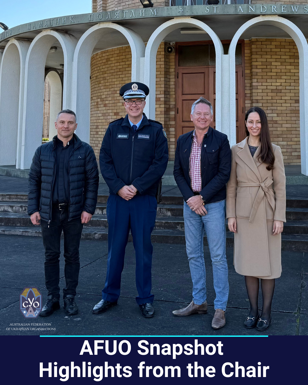 The Auburn Police Area Command met with representatives from the AFUO, Ukrainian Council of NSW – ОУГ НПВ and St Andrew’s Ukrainian Catholic Church to establish new relationships and discuss community concerns. Grateful to Superintendent Commander Toynton and Multicultural Community Liaison Officer Luo for the genuine interest and support.