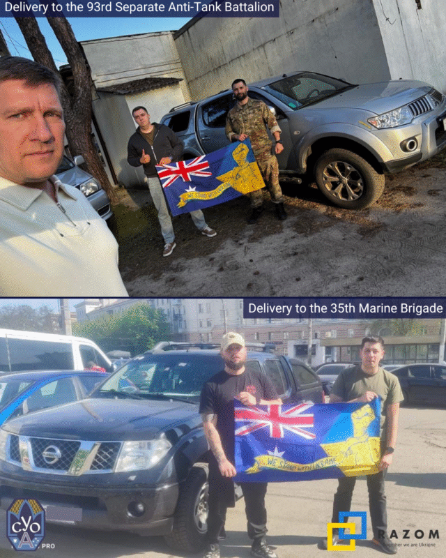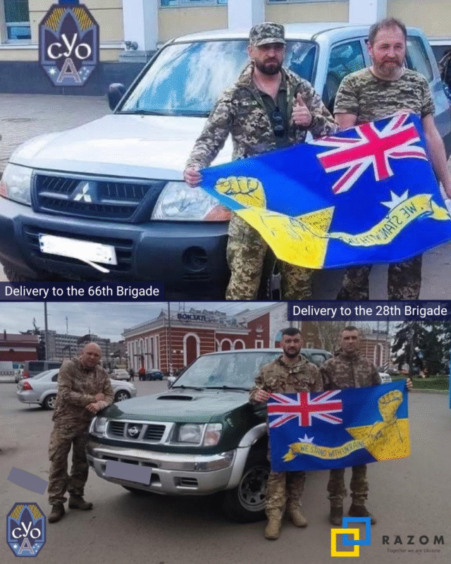 Defend Ukraine Appeal – with the help of our partner Razom For Ukraine, delivered 4 evacuation vehicles to the frontline, assisting the 66th Separate Mechanised Brigade (66 окрема механізована бригада), 28th Separate Mechanised Brigade (28-ма окрема механізована бригада), 93rd Separate Anti-Tank Battalion (93 окремий протитанковий батальйон) and 35th Separate Marine Brigade (35-та окрема бригада морської піхоти). These vehicles fulfilled requests that came from our community members in QLD, NSW, and ACT. Sergiy Bartovschuk, Kulbakha Tetiana, Emiliia Kalinchuk, Inna Stryzhenko.