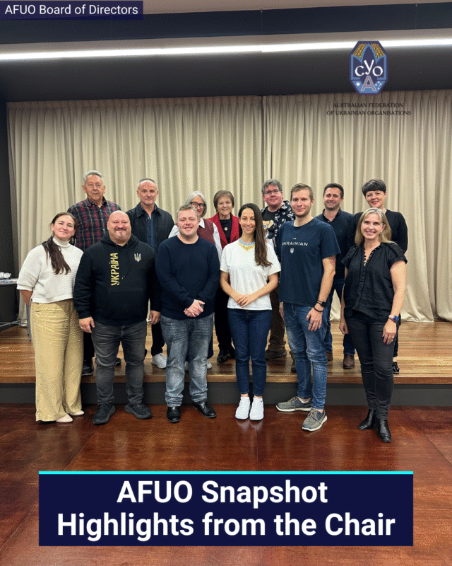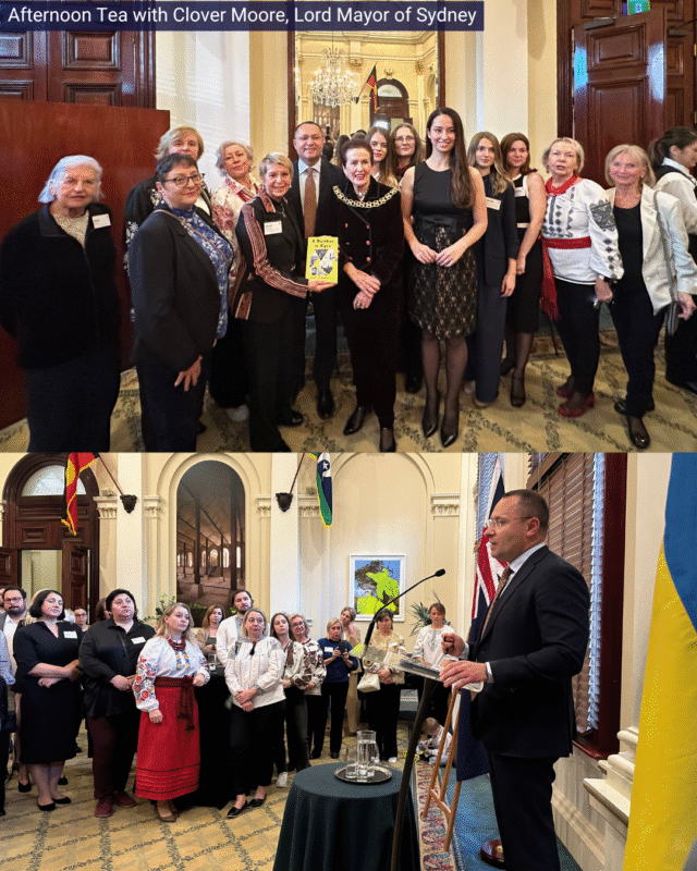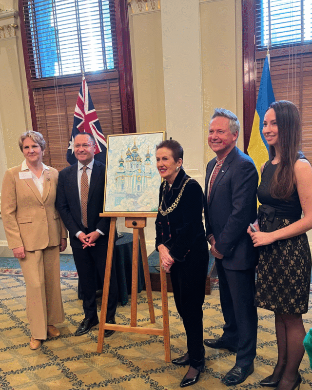 Lord Mayor’s Afternoon Tea – it was a privilege to attend an event at Sydney Town Hall for members and supporters of the Ukrainian Community. Highlights included speeches by Lord Mayor Clover Moore, His Excellency Mr Vasyl Myroshnychenko , Ambassador of Ukraine, and Andrew Mencinsky, President of the Ukrainian Council of NSW – ОУГ НПВ. The UCNSW presented a gift to the City of Sydney – the most beautiful painting of St Andrew’s Church in Kyiv by Tetiana Koldunenko.