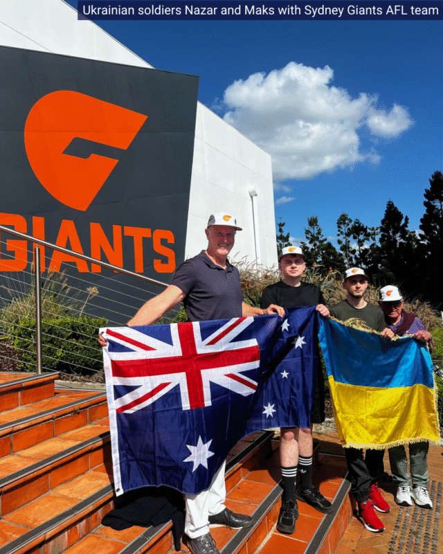 Sports Diplomacy: Great friends of Ukraine, John McMurtrie and Paul Carvosso organised a meet & greet for Nazar “Kapa” and Maks with the Sydney GWS Giants AFL team. This special opportunity allowed the Ukrainian defenders to meet Australian sports players and coaches at the training grounds, build cultural bridges and raise awareness about Ukraine’s resilience through sport.