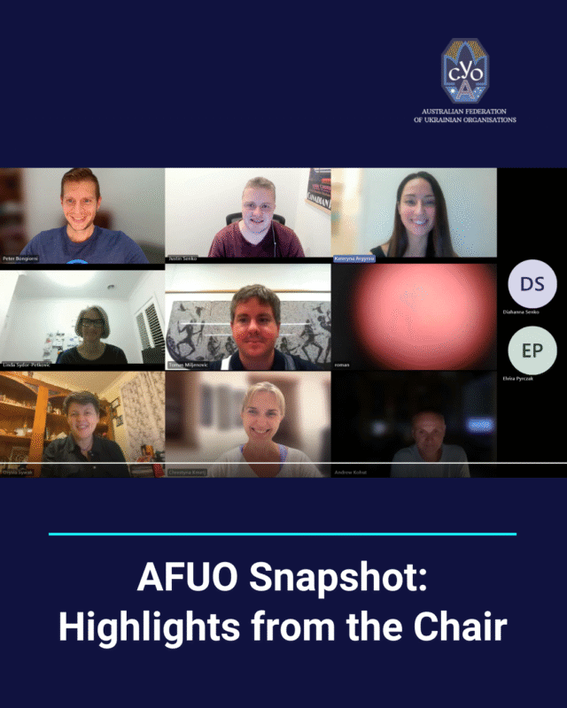 I am honoured to use my role as AFUO Chair to advocate for and take action toward the betterment of Ukraine and the Ukrainian diaspora in Australia. Together, let’s move forward with unity, resilience and purpose!