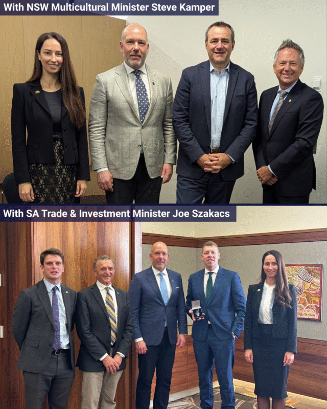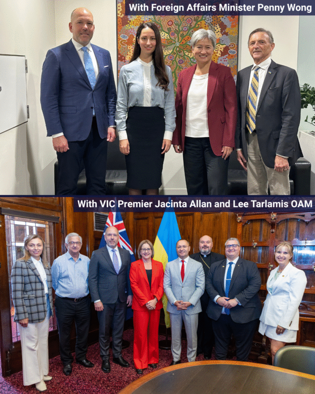 With AFUO Board members, advisers and NSW, SA and VIC State Hromada Presidents, we facilitated a series of meetings for Paul Grod with Foreign Affairs Minister Penny Wong – Senator for SA, Shadow Foreign Affairs Minister David Coleman – Member for Banks, Premier of VIC Jacinta Allan, NSW Multicultural Affairs Minister Steve Kamper, SA Minister for Trade Joe Szakacs MP and state government parliamentarians.