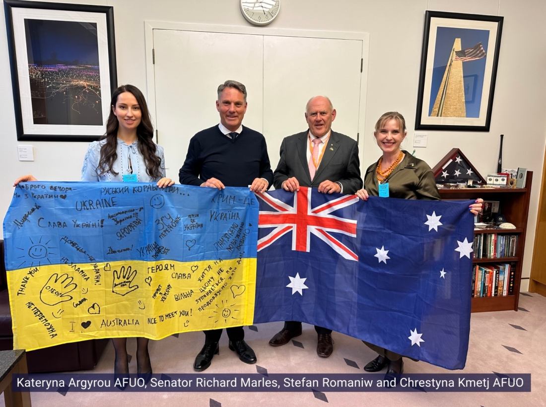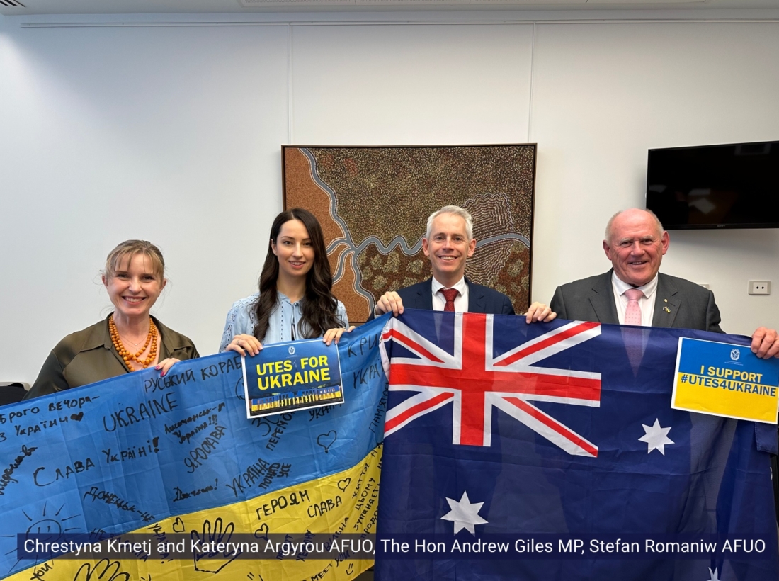 Matters discussed included continued defence funding for Ukraine, the AFUO’s #Utes4Ukraine initiative, visa issues for displaced Ukrainians, a proposed Government motion condemning the 1932-33 Holomodor as genocide, declarations regarding Russia being a terrorist state and Government enforcement of the Magnitsky Act.