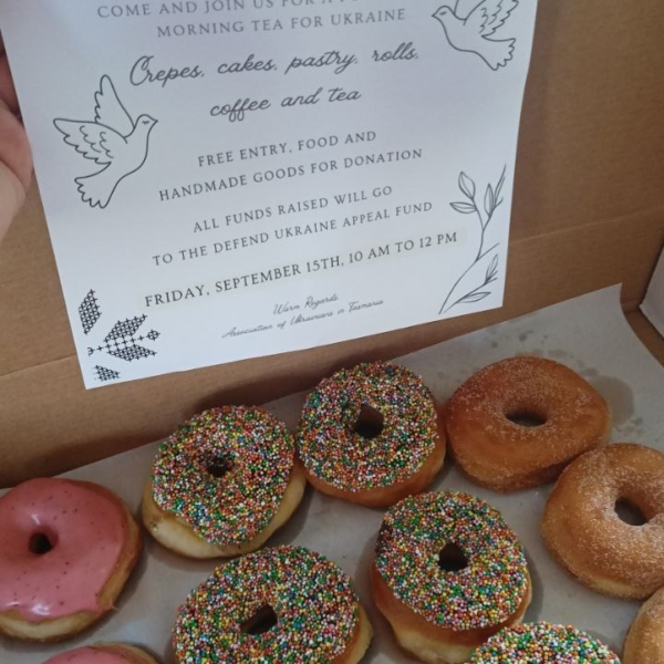 In Hobart, local businesses and charities donated pastries and handmade knitted items at an Association of Ukrainians in Tasmania fundraiser.