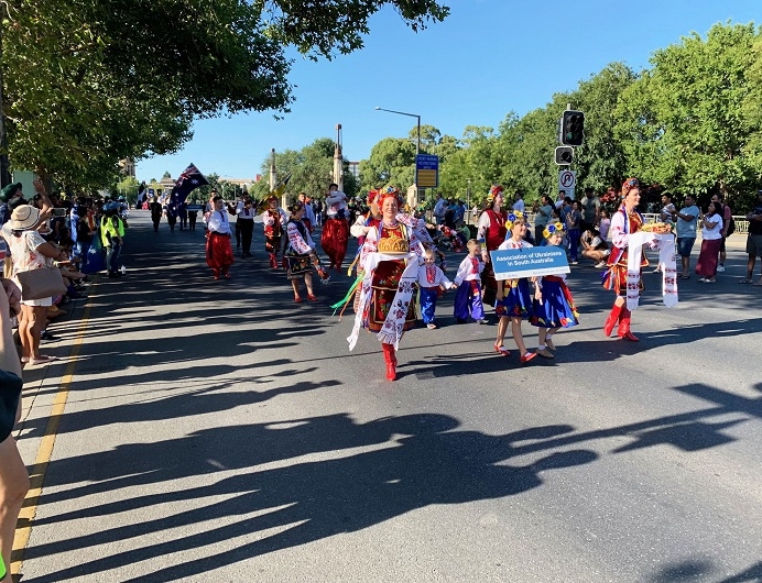 In Adelaide, members of the Ukrainian community including the Volya dancers and Lemko musicians, led the ‘Respecting Country’ Parade – a great honour. The Association of Ukrainians in South Australia (AUSA) featured prominently in the official ceremony, with Bernadette Belej reminding the VIPs and the 29,000 strong crowd about Russia’s brutal invasion of Ukraine.