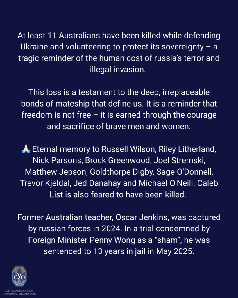 To Russell’s family and loved ones – your grief is shared by Australian-Ukrainians and Ukrainians around the world. Russell’s sacrifice is now forever woven into Ukraine’s story of resistance and resilience.