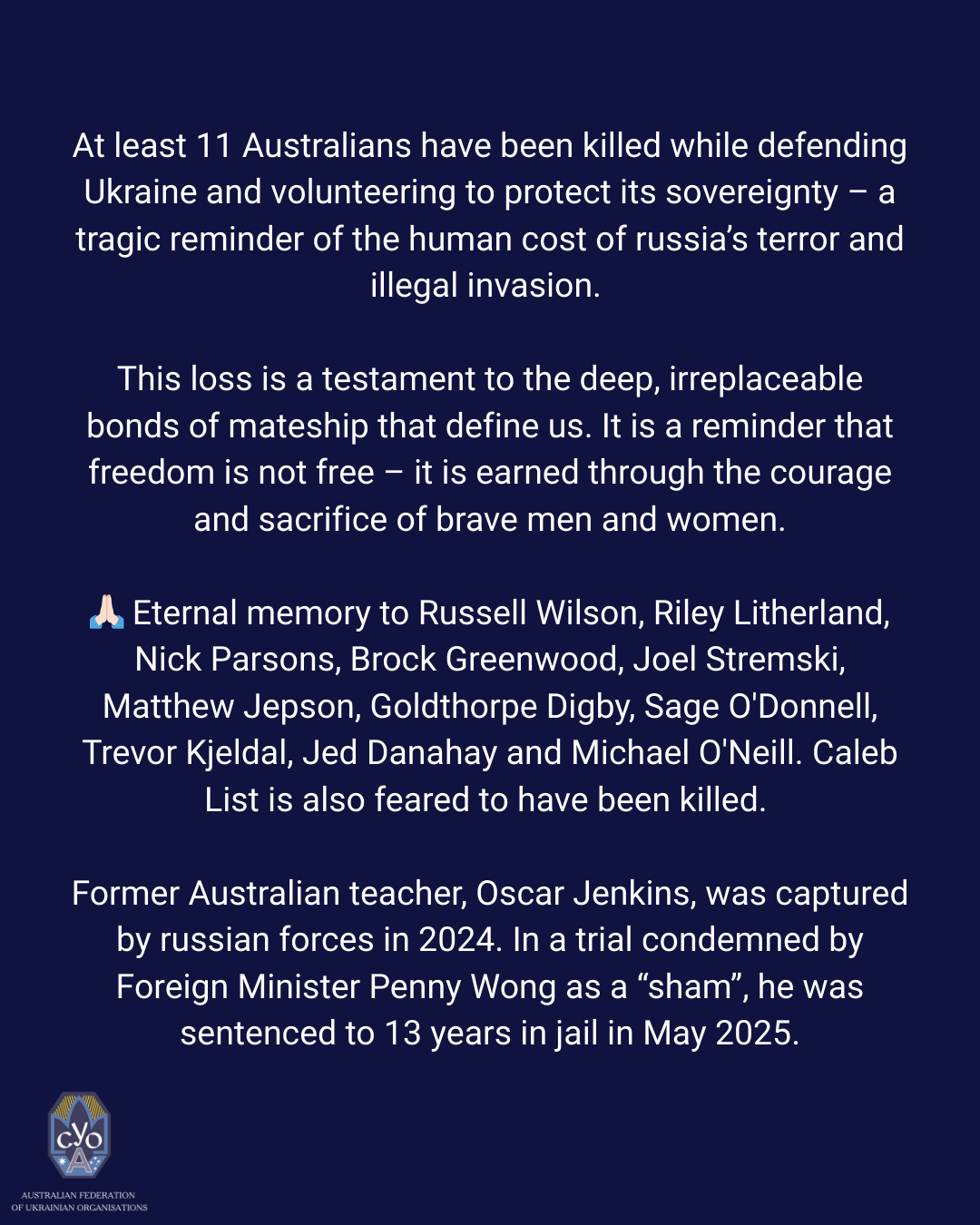 The Australian Federation of Ukrainian Organisations (AFUO) is deeply saddened by the loss of Russell Allan Wilson, a courageous Australian who has been reported killed while fighting in Ukraine.