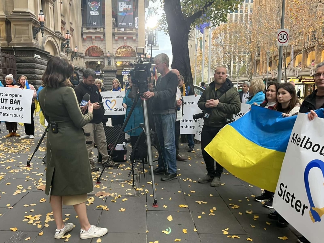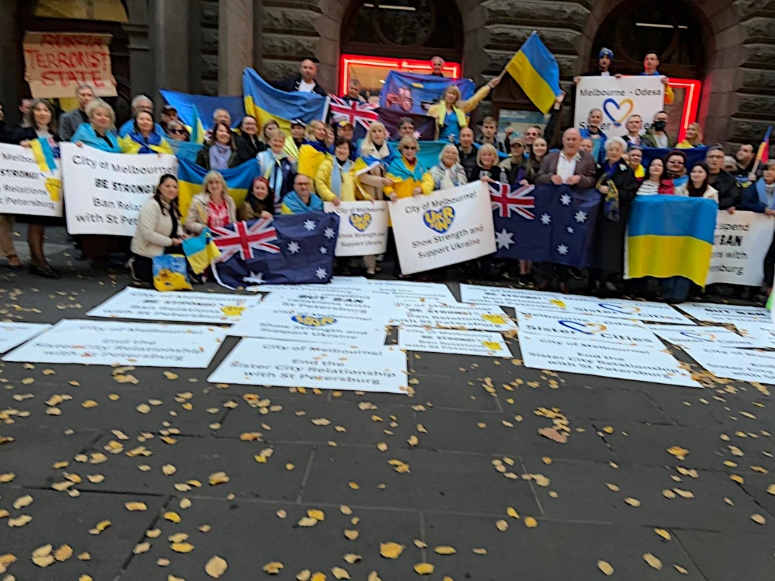 The councillors met with members of the Ukrainian community who had gathered at the Melbourne Town Hall from 4pm to voice their anger that the City of Melbourne was continuing to suspend – and not cancel – the agreement.