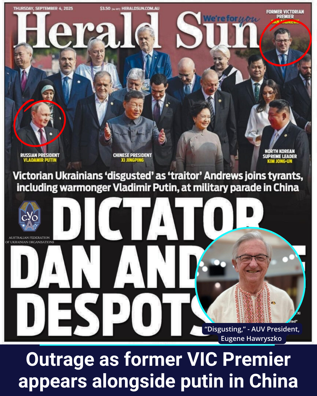 Association of Ukrainians in Victoria (AUV) Chairman Eugene Hawryszko voiced our community’s outrage after former Victorian Premier Dan Andrews joining indicted war criminal and tyrant vladimir putin at China’s military parade in Beijing’s Tiananmen Square yesterday.