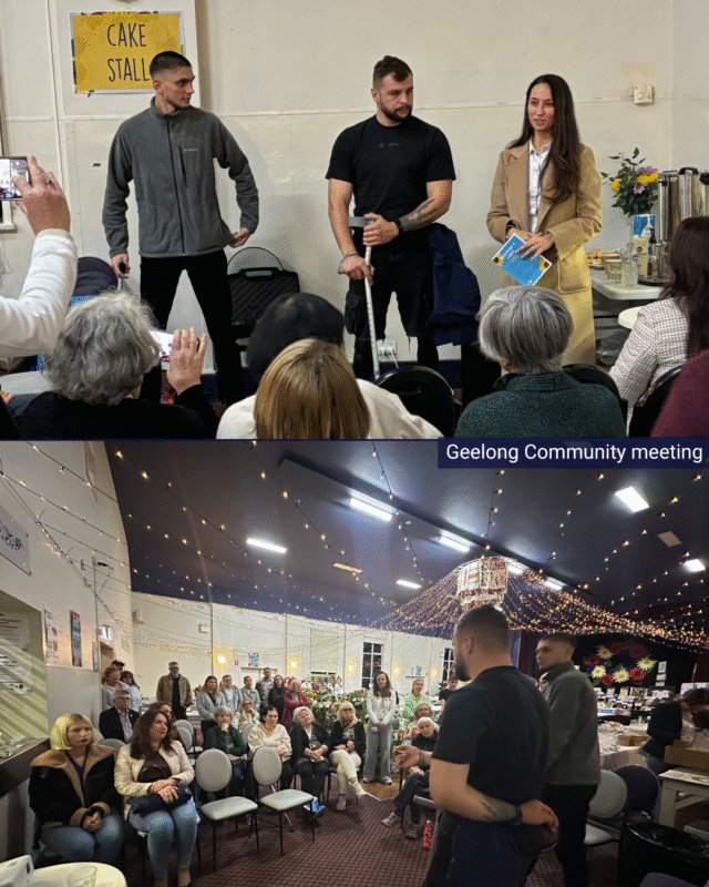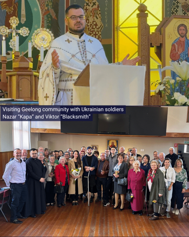 Trip to Geelong – this weekend, I had the pleasure of visiting Geelong for the first time. I was honoured to be joined by our brave defenders Viktor “Blacksmith” and Nazar “Kapa”. Our Ukrainians in Geelong – Українці в Джілонґу community may be small, but they are mighty! Grateful to Mark Tkaczuk for helping organise a community meeting at Ukrainian House on Friday and at church on Sunday. Thank you to Wally Rava and Fr Myroslav Vons for hosting.