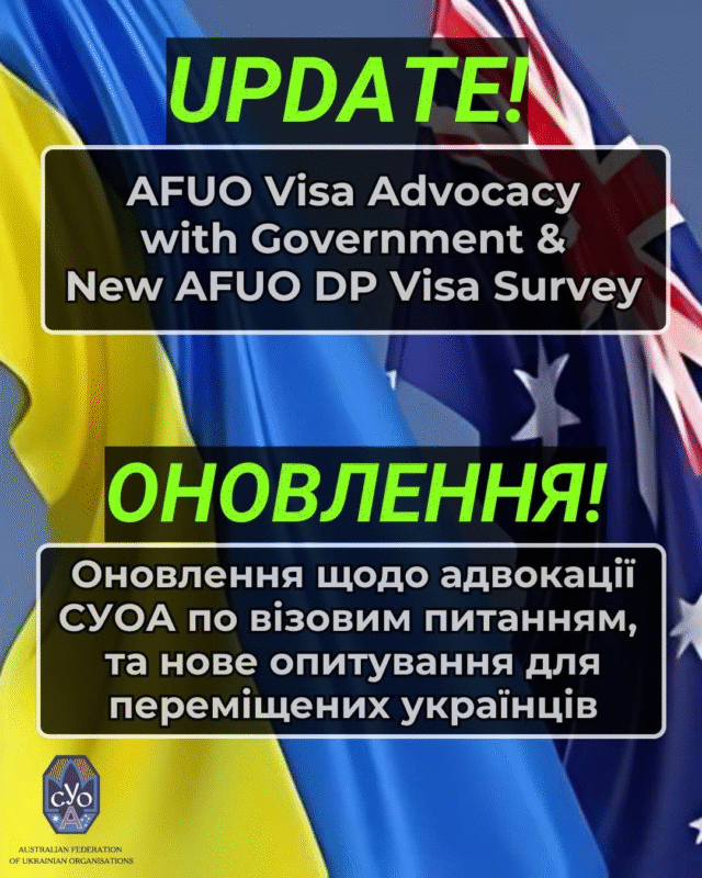 Visa survey for displaced Ukrainians – following a meeting with the Office of the Minister for Immigration and the Department of Home Affairs, the AFUO has launched an important visa survey for displaced Ukrainians. I (along with other community leaders) have been receiving a great deal of emails and calls regarding different situations and personal circumstances displaced Ukrainians are currently facing. In order to present the proper facts to the Minister and find an appropriate solution, we must have the appropriate information – so we don’t miss anything and have accurate information, please fill out our survey here: