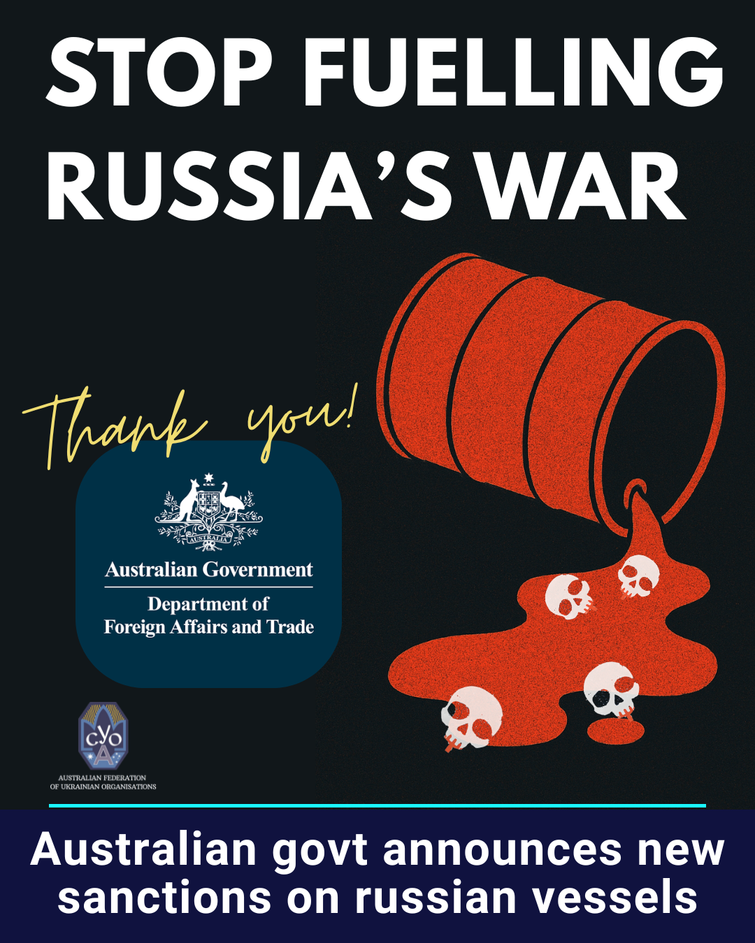 The Australian Federation of Ukrainian Organisations (AFUO) welcomes today’s announcement by the Australian Government imposing sanctions on Russia’s so-called “shadow fleet” – a network of vessels used to circumvent international sanctions and transport Russian oil covertly. The AFUO is particularly grateful to Minister Penny Wong and her team for leading the charge on this initiative.