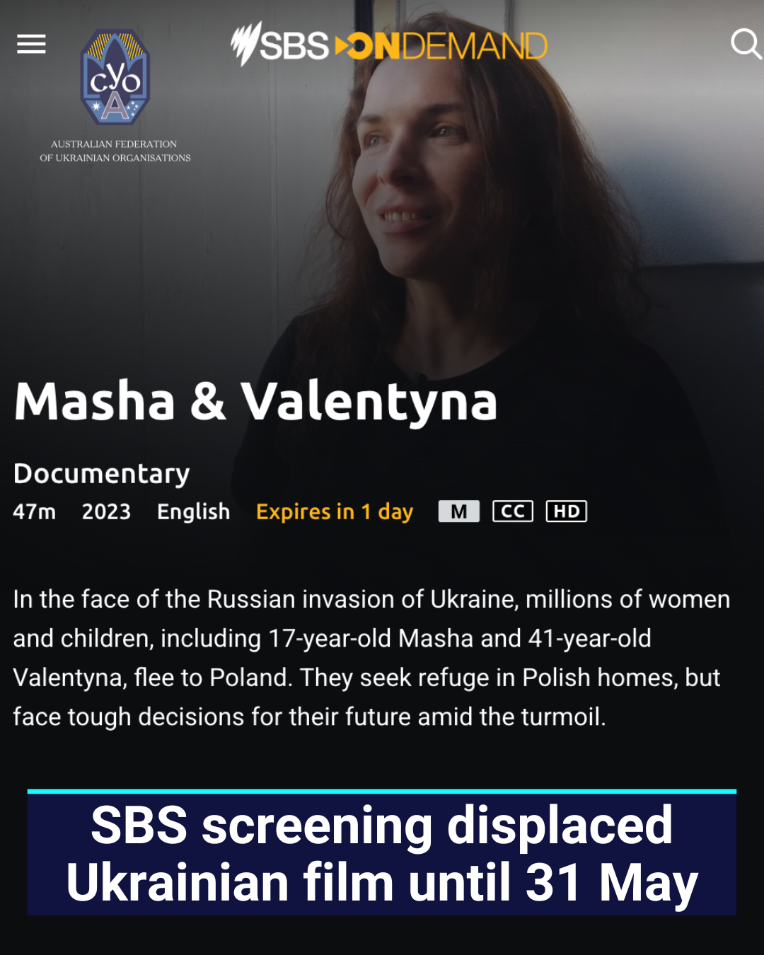 Watch it here: https://www.sbs.com.au/ondemand/movie/masha-and-valentyna/2218100803979