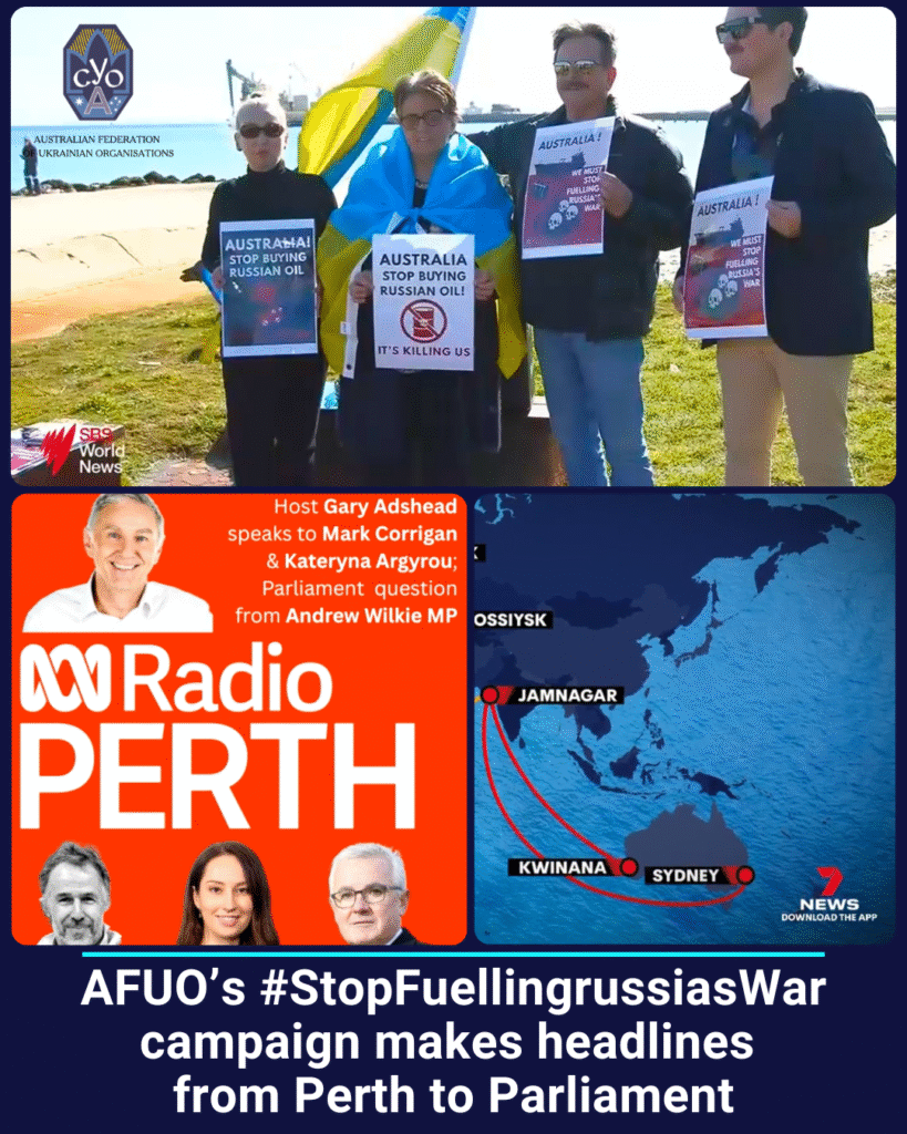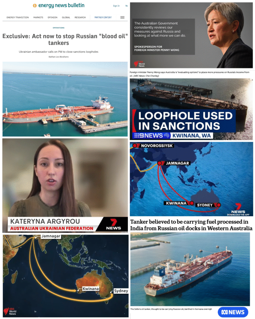 Tuesday’s community protest in Kwinana, WA — part of the AFUO’s national push to ban imports of refined russian crude oil — received wide media attention, including: