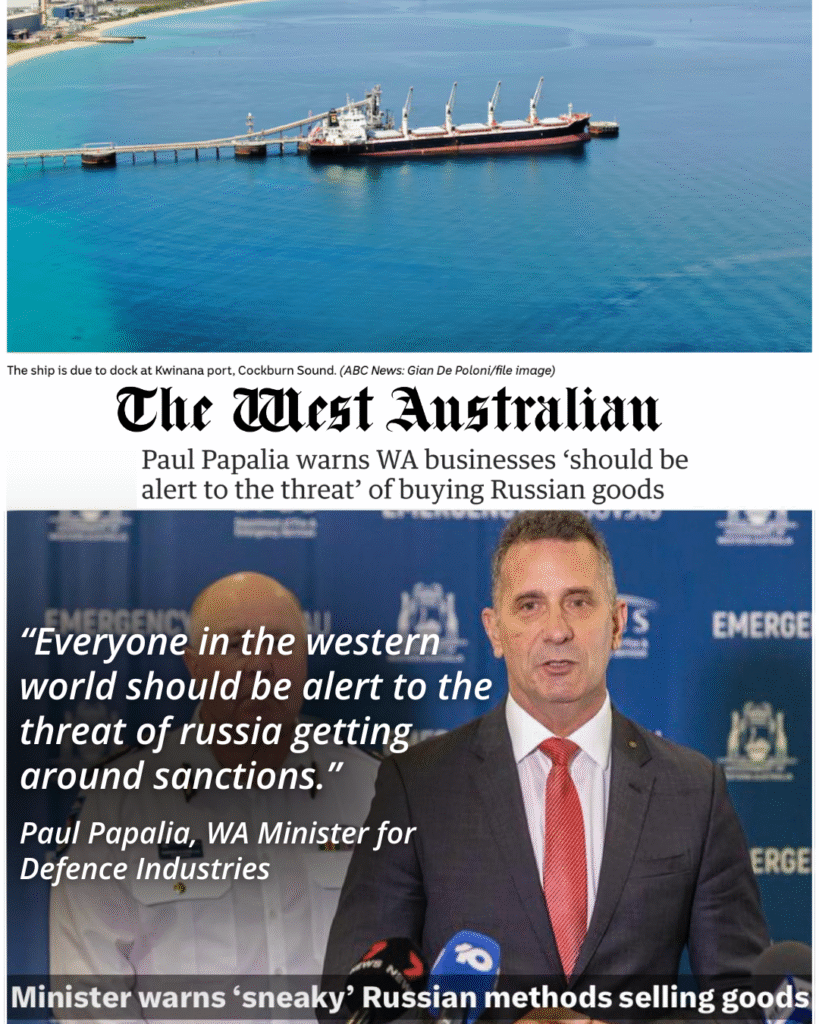 Even WA’s Minister for Defence Industries Paul Papalia, warned: “Everyone in the western world should be alert to the threat of Russia getting around sanctions…and getting funds for fighting a war in Ukraine, by sneaky means.”
