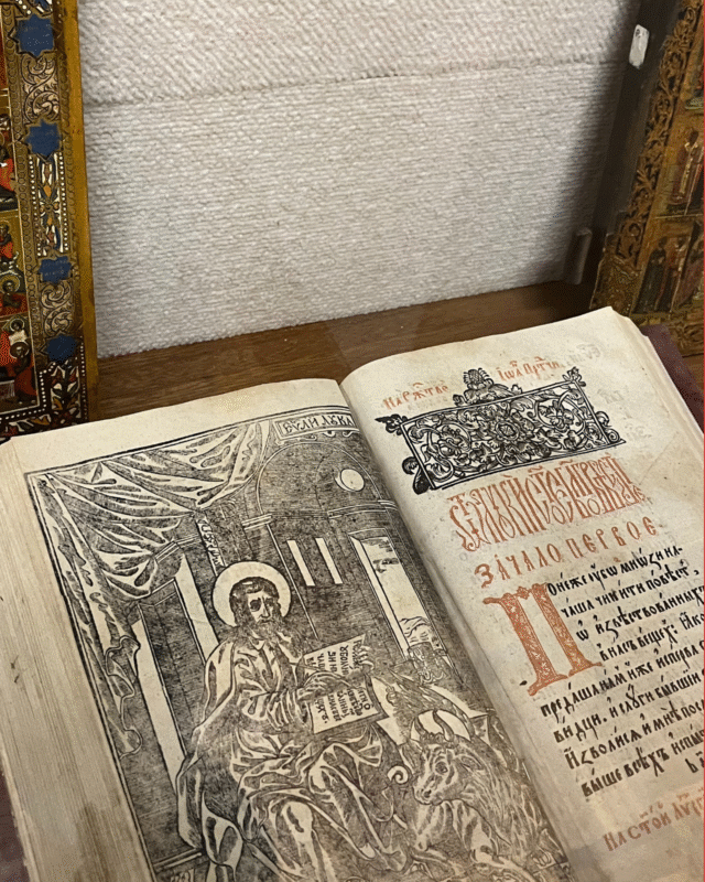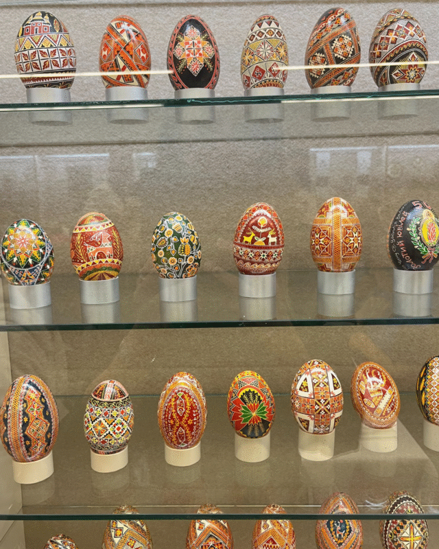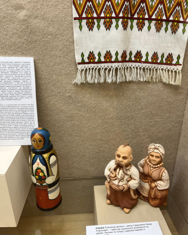 The exhibition features intricate wooden carvings, religious icons and antique slavic texts, colourful pysanky and UNESCO heritage-listed Kosiv ceramics from the Carpathian Mountains, among other priceless artefacts.