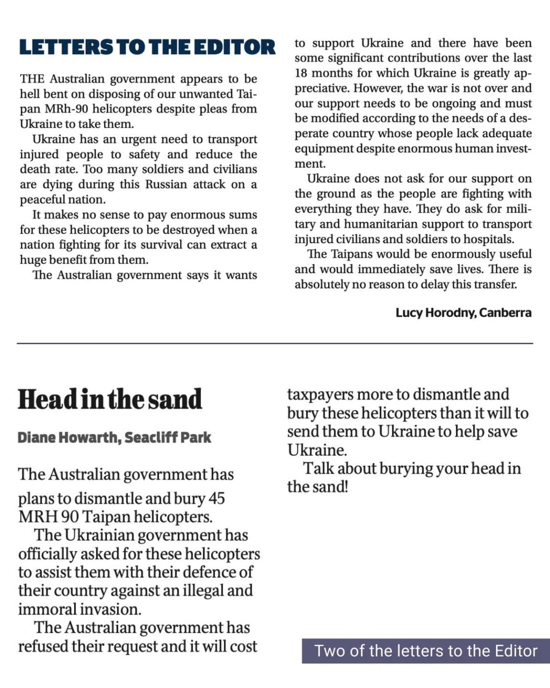 We congratulate our community, which came out in force last week to ask why Australia was burying its Taipan helicopters instead of sending them to Ukraine to conduct medical evacuations.