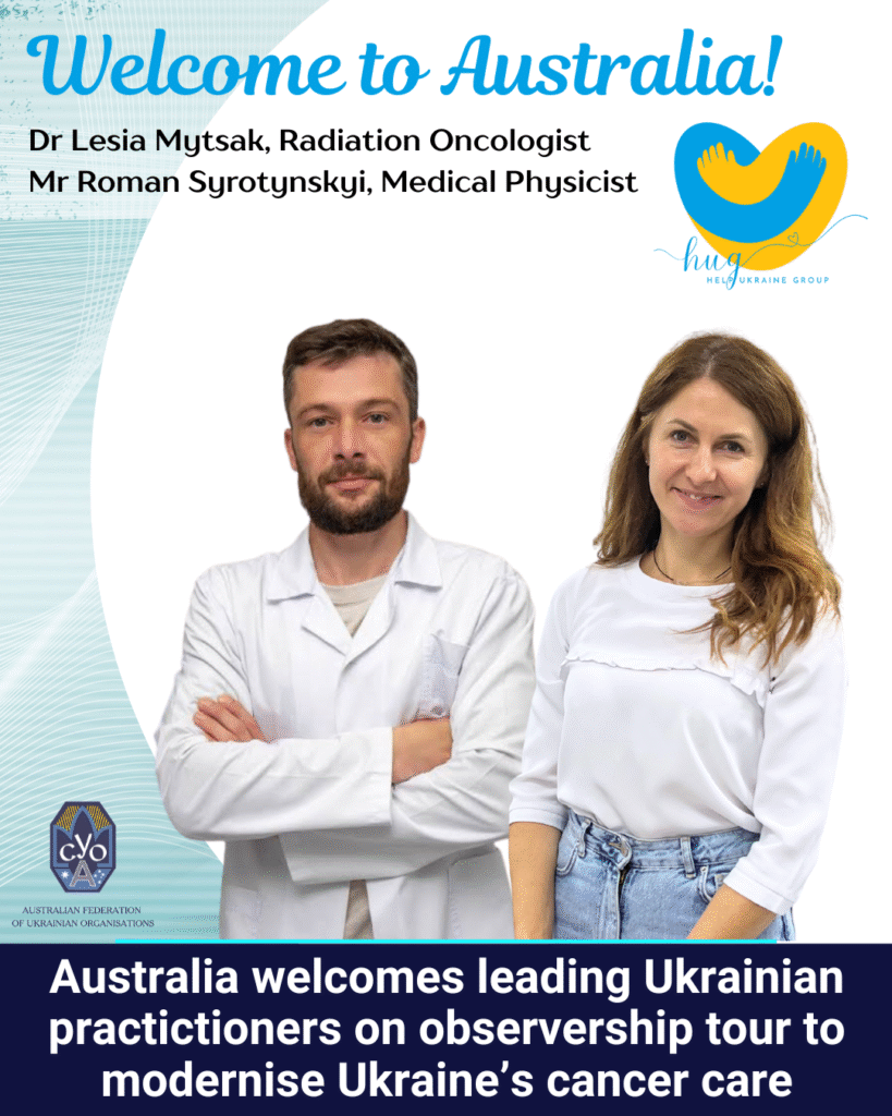 An exciting and huge announcement: the Australian Federation of Ukrainian Organisations (AFUO) warmly welcomes Dr Lesia Mytsak, Radiation Oncologist, and Mr Roman Syrotynskyi, Medical Physicist – Ukrainian cancer specialists visiting Australia to deepen their expertise, through the Help Ukraine Group (HUG).