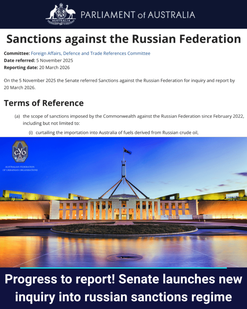 Yesterday, following months of pressure from the Australian Federation of Ukrainian Organisations, the Australian Senate launched an inquiry into the scope of Australian Government sanctions on russia – including those related to the importation of refined russian oil.