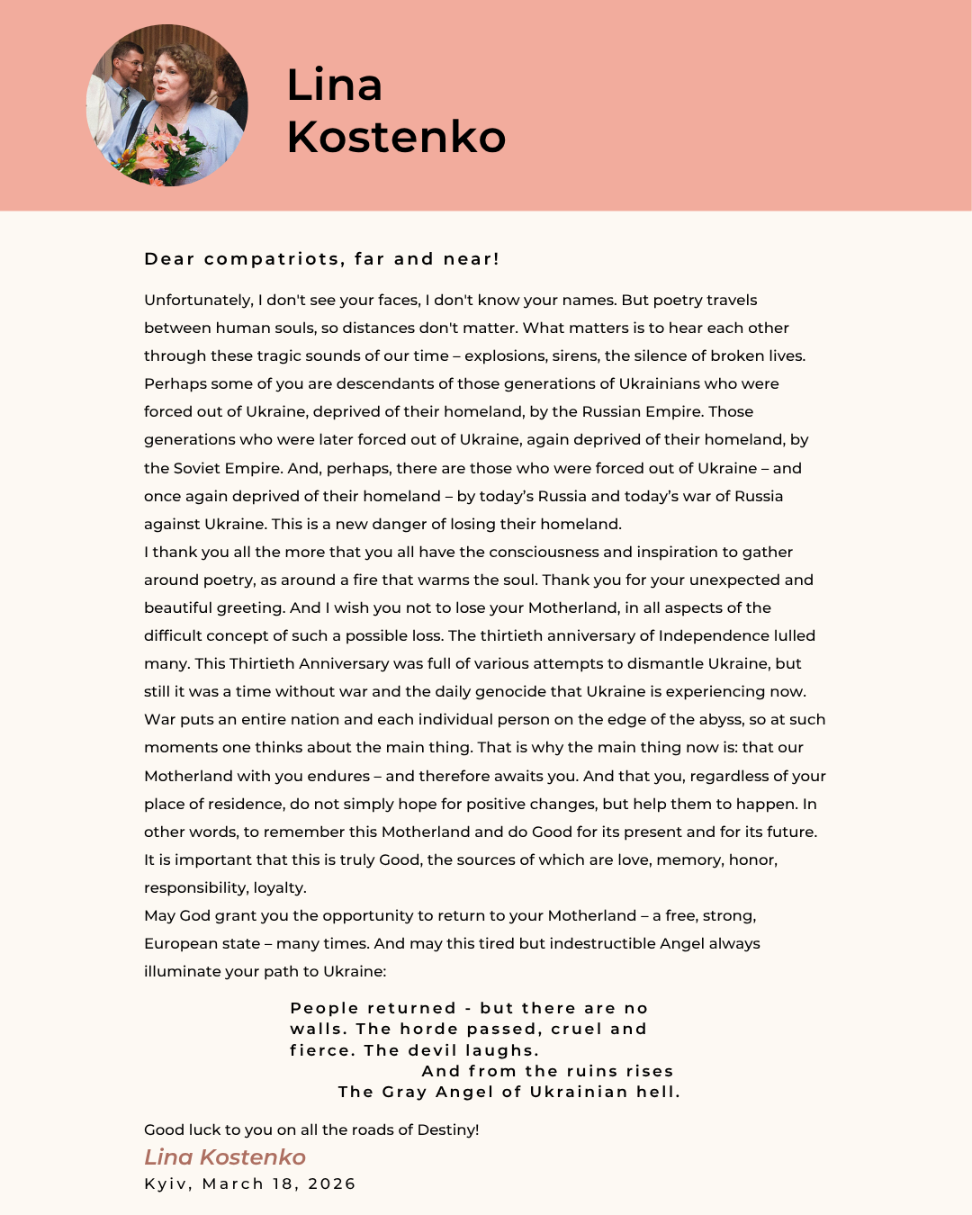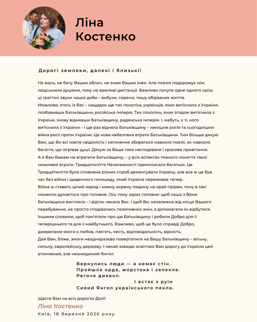 Kostenko speaks to the reality of this moment – a time shaped by war, loss, and uncertainty, but also to responsibility: “The main thing now is: that our Motherland endures — and therefore awaits you.”