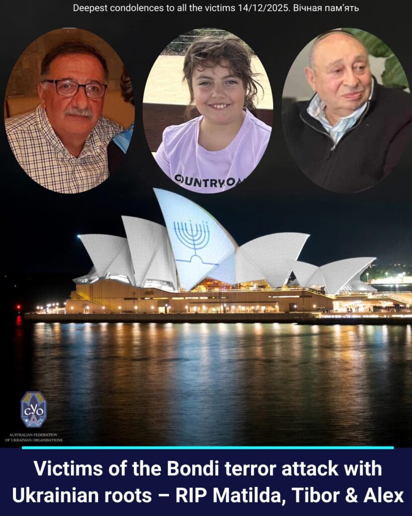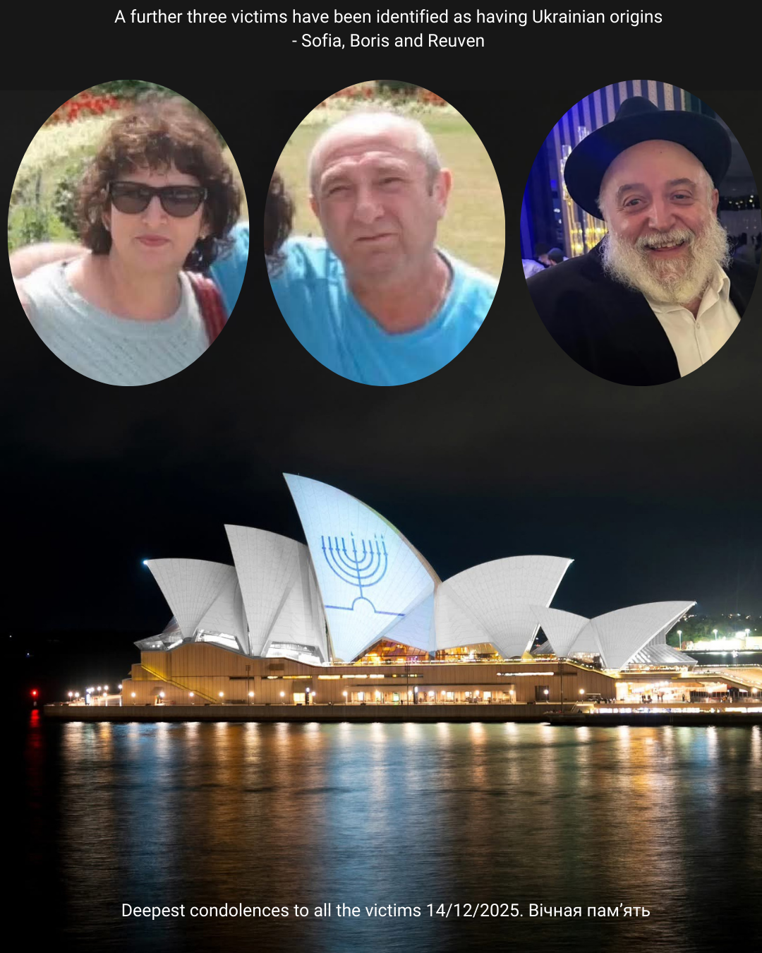 It has been confirmed that several of the 15 victims were of Jewish and Ukrainian background. On behalf of the Australian-Ukrainian community, the Australian Federation of Ukrainian Organisation (AFUO) extends its deepest condolences to their families and loved ones.