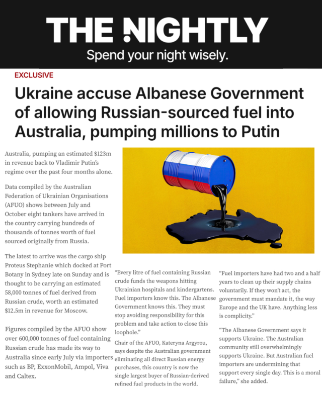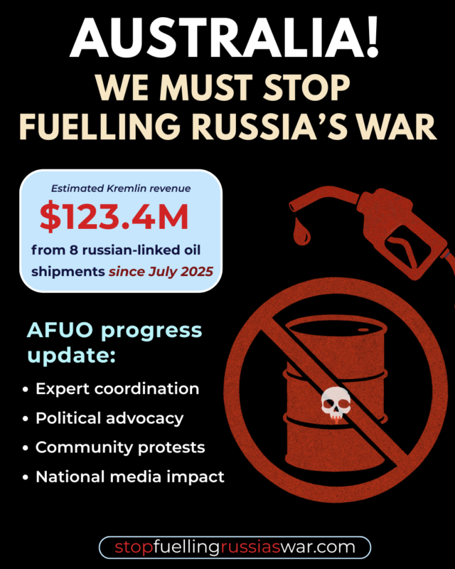 The AFUO continues to lead the national effort to close the russian oil loophole – ensuring Australia’s fuel supply no longer funds russia’s brutal war on Ukraine.