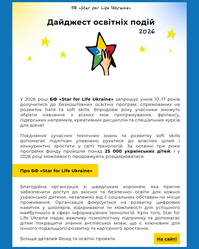 Українські діти та підлітки віком 10-17 років, які проживають за кордоном, зокрема в Австралії та Новій Зеландії, запрошуються взяти участь у БЕЗКОШТОВНИХ онлайн-освітніх програмах у 2026 році, що проводяться благодійним фондом Star for Life Ukraine.
