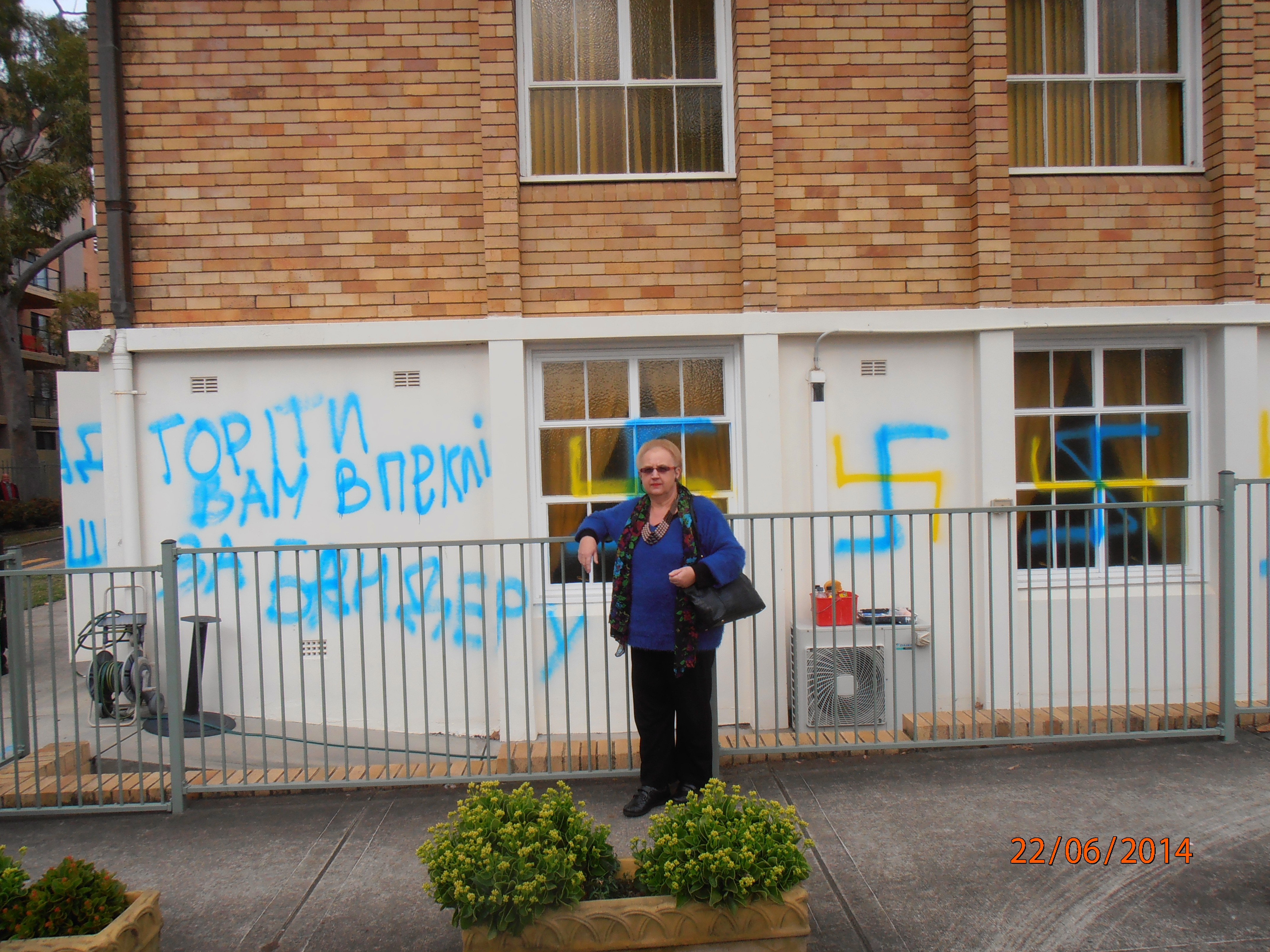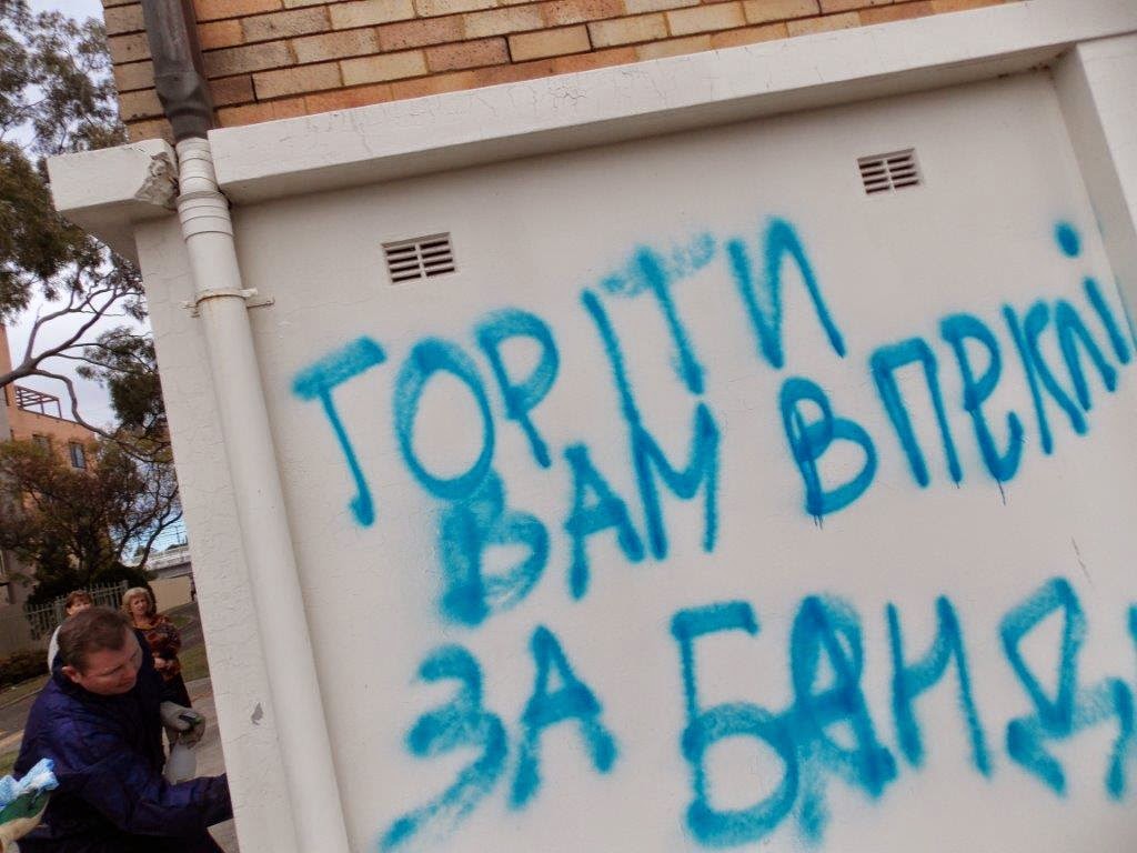 Ніхто з нас не знає ХТО це наробив. З російської Громади телефонували мені в понеділок 23.6. і вони запевняють, що то ніхто з їх спільноти не робив. Управа СУОА відповідно зареагувала на статтю, яка появилася в російські газеті в Сіднеї, де засуджується такий варварський вчинок.