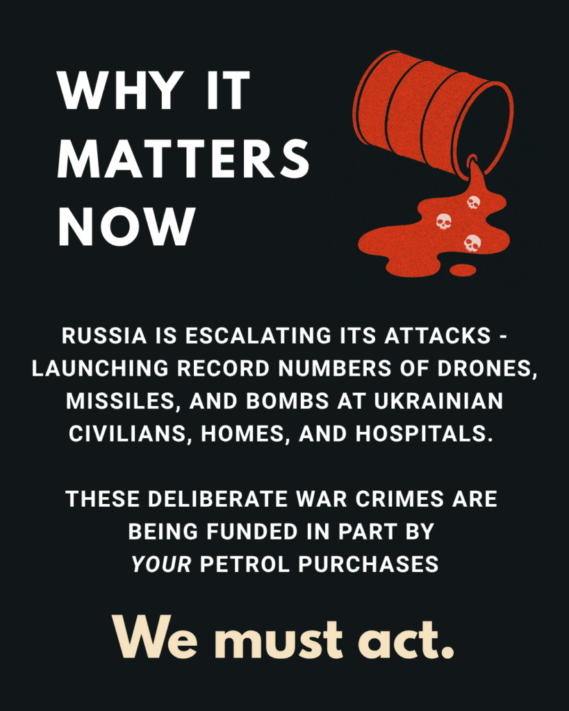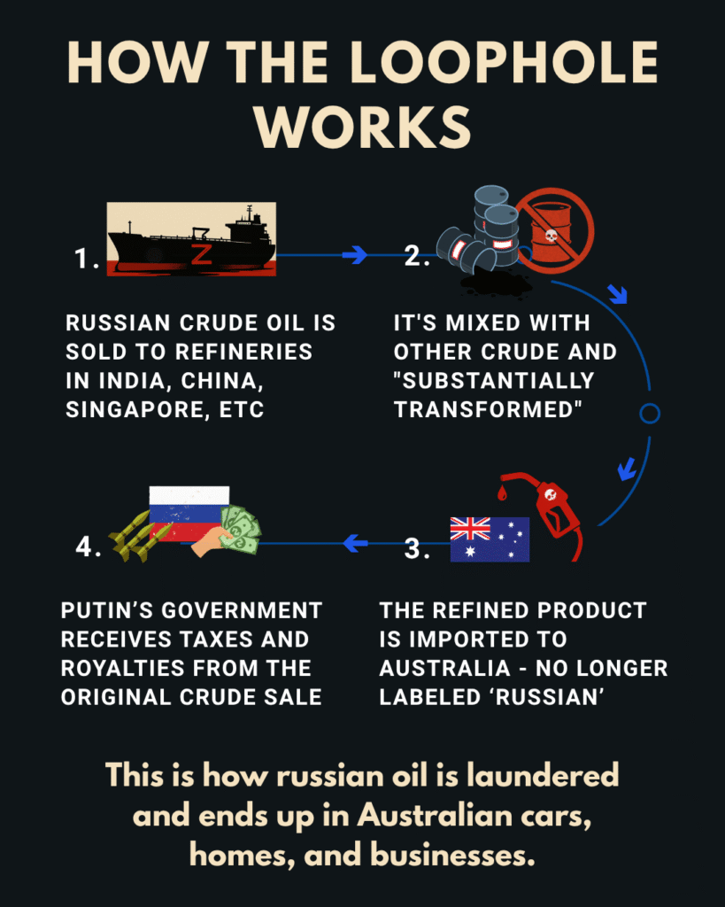 This loophole is lethal. The oil tax revenue Australia sends to the Kremlin feeds the russian war machine, props up its economy, undermines global sanctions, and prolongs the suffering and destruction in Ukraine.