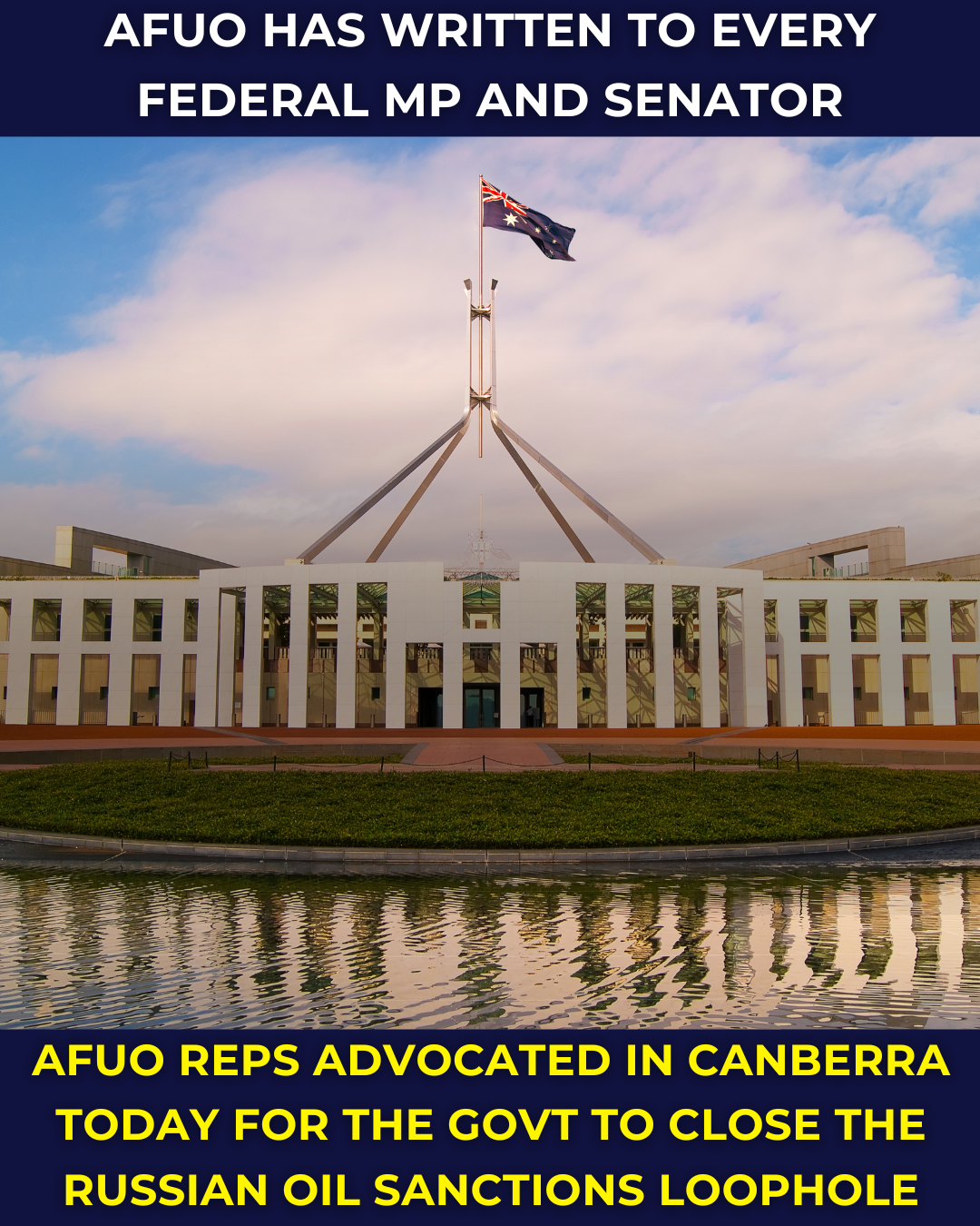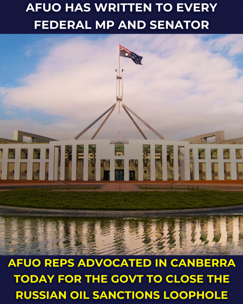 The AFUO has written to every Federal MP and Senator urging support for the banning of refined petroleum containing russian crude.