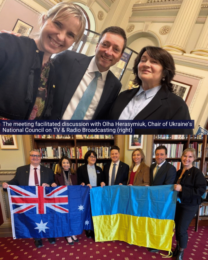 Hosted by Chair Lee Tarlamis MP OAM, Co-Chair Matthew Guy MP, andMPs Kat Theophanous MP and Michael Galea MP, the bi-partisan meeting highlighted the crucial role of safeguarding independent media during wartime and the need to protect Ukraine’s cultural identity – especially in occupied territories, where children are targeted with russian misinformation.