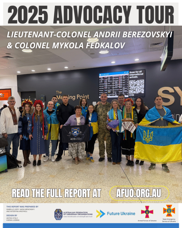 What a powerful few weeks! The advocacy tour of Lt-Colonel Andrii Berezovskyi (Armed Forces of Ukraine) and Colonel Mykola Fedkalov (SES, Odesa) across Australia made a significant impact. 📝Read the full report here: https://afuo.org.au/wp-content/uploads/2025/10/2025-10-02-AFUO-ADVOCACY-REPORT.pdf