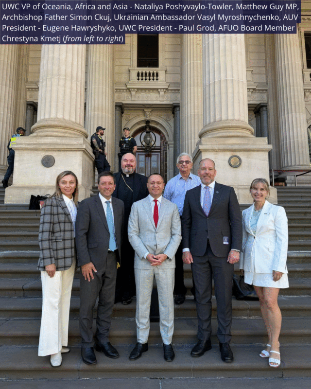 We sincerely thank the strong delegation which participated in the Victorian meetings – His Excellency Vasyl Myroshnychenko – Ukrainian Ambassador, Very Rev. Mitred Archpriest Fr. Simon Ckuj – Parochial Vicar of Sts. Peter and Paul Cathedral Parish, Nataliya Poshyvaylo-Towler – Regional Vice President UWC, Eugene Hawryszko – AUV President and Chrestyna Kmetj – AFUO Board member.