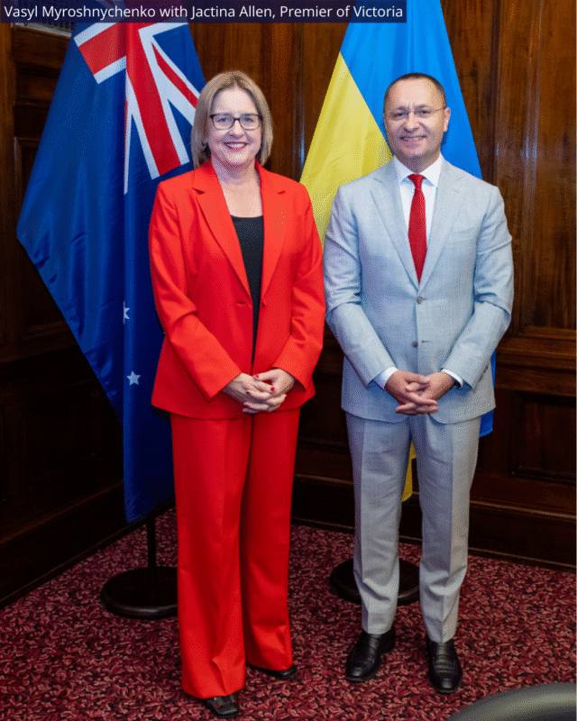 The AFUO deeply appreciates the role of His Excellency Vasyl Myroshnychenko, Ukrainian Ambassador, in organising a meeting with the Victorian Premier Jacinta Allan and inviting Ukrainian community leaders to join the meeting.
