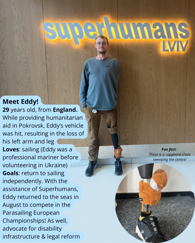 Eddy, 29, from England, is a sailor turned humanitarian worker, who courageously left his successful career on the seas to head the call of Ukraine’s defence. While conducting a mission in Pokrovsk in January this year, Eddy’s vehicle suffered a direct hit, resulting in the loss of his left arm and leg. His recovery at Superhumans has inspired him to advocate for accessibility and disability rights in Ukraine, home to more than 86,000 amputees.
