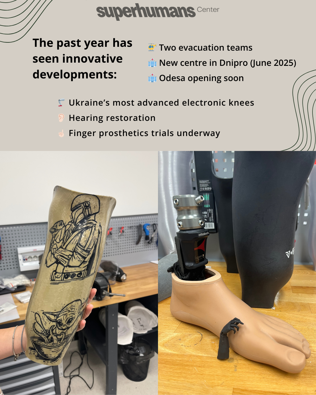 In 2025,, Superhumans expanded its world-class rehabilitation services to include hearing restoration and trials for finger prosthetics. Alongside reconstructive surgeries for faces, limbs, and amputations, the centre’s specialists also introduced Ukraine’s most advanced electronic knees – among the most sophisticated prosthetics available globally. Only released in 2024, these devices are transforming mobility and independence for patients.