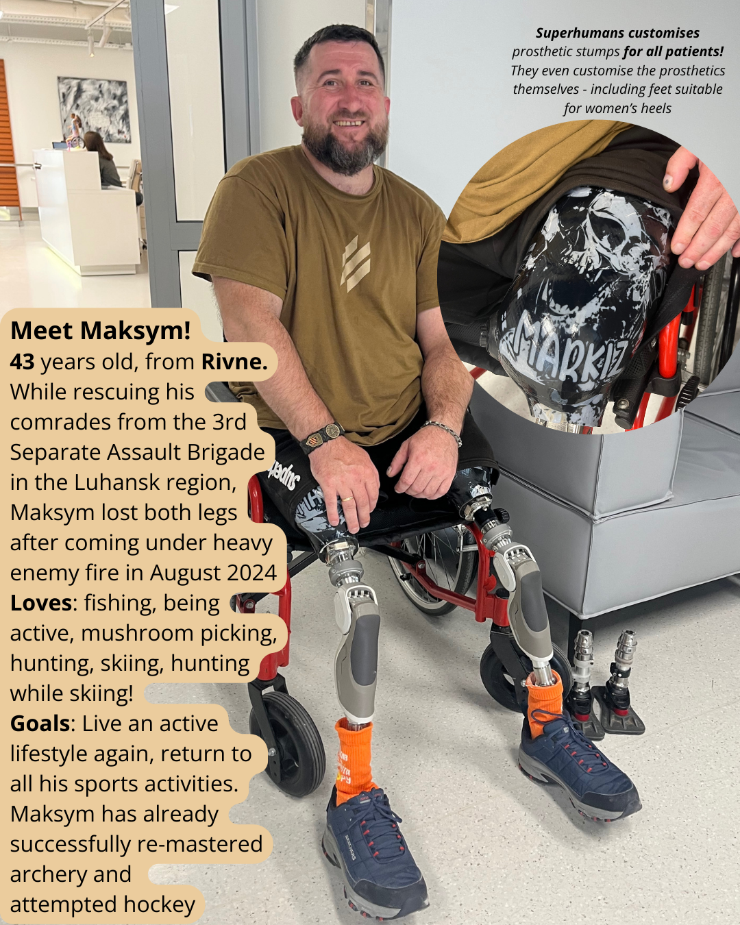 Maksym, 43, from Rivne, is a veteran from Ukraine’s 3rd Separate Assault Brigade. In August 2024, while rescuing injured comrades in the Luhansk region, lost both legs after coming under heavy enemy fire. After two hospitals and a long journey, Maksym arrived at the Superhumans centre in Lviv. Over a year of therapy, he has gone from first fittings to walking confidently on mechanical knees.