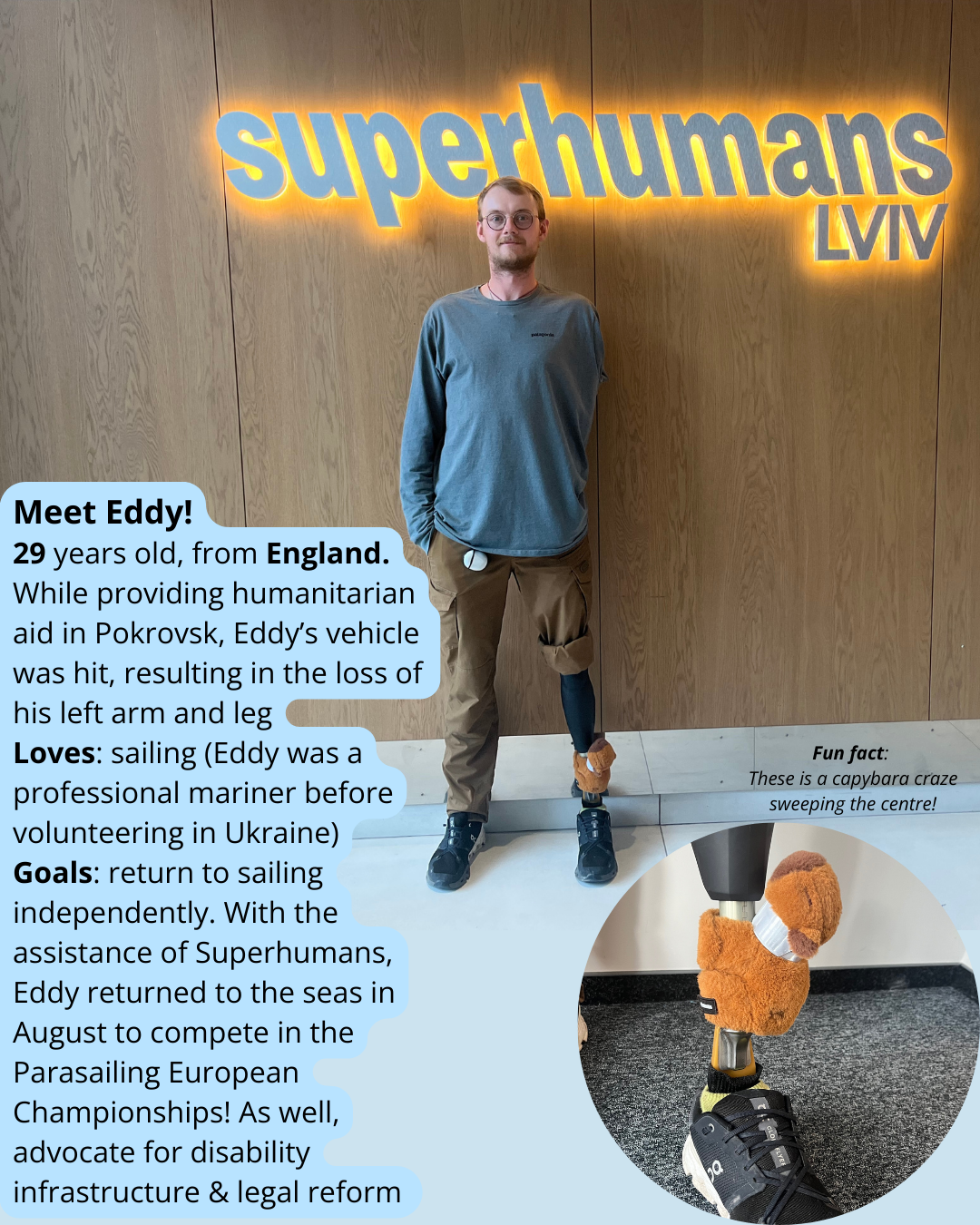 Eddy, 29, from England, is a sailor turned humanitarian worker, who courageously left his successful career on the seas to head the call of Ukraine’s defence. While conducting a mission in Pokrovsk in January this year, Eddy’s vehicle suffered a direct hit, resulting in the loss of his left arm and leg. His recovery at Superhumans has inspired him to advocate for accessibility and disability rights in Ukraine, home to more than 86,000 amputees.