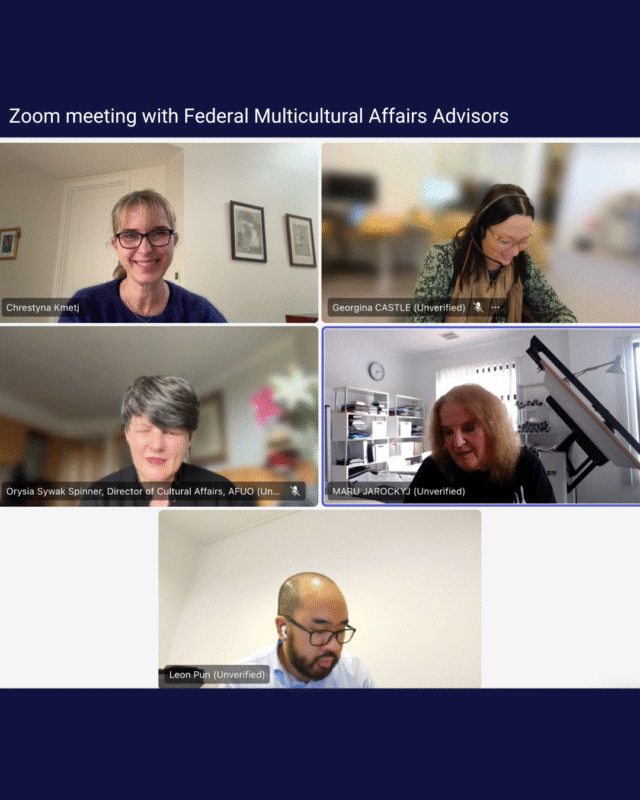 On 8 July, Maru Jarockyj (Ukrainian Museum of Australia Director), Chrestyna Kmetj (AFUO Board Member) and Orysia Sywak Spinner (AFUO Cultural Director) met online with Leon Pun, Multicultural Affairs Advisor, and Georgina Castle, Interim Advisor to Hon Dr Anne Aly, Minister for Multicultural Affairs.