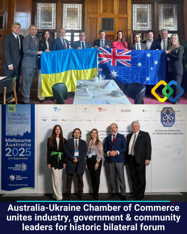 The Australia-Ukraine Chamber of Commerce (AUCC) hosted “Resilient Partnerships” business forum at the 14th World Chambers Congress with the Посольство України в Австралії / Embassy of Ukraine in Australia and the Ukrainian Chamber of Commerce and Industry – uniting business, political and community leaders.
