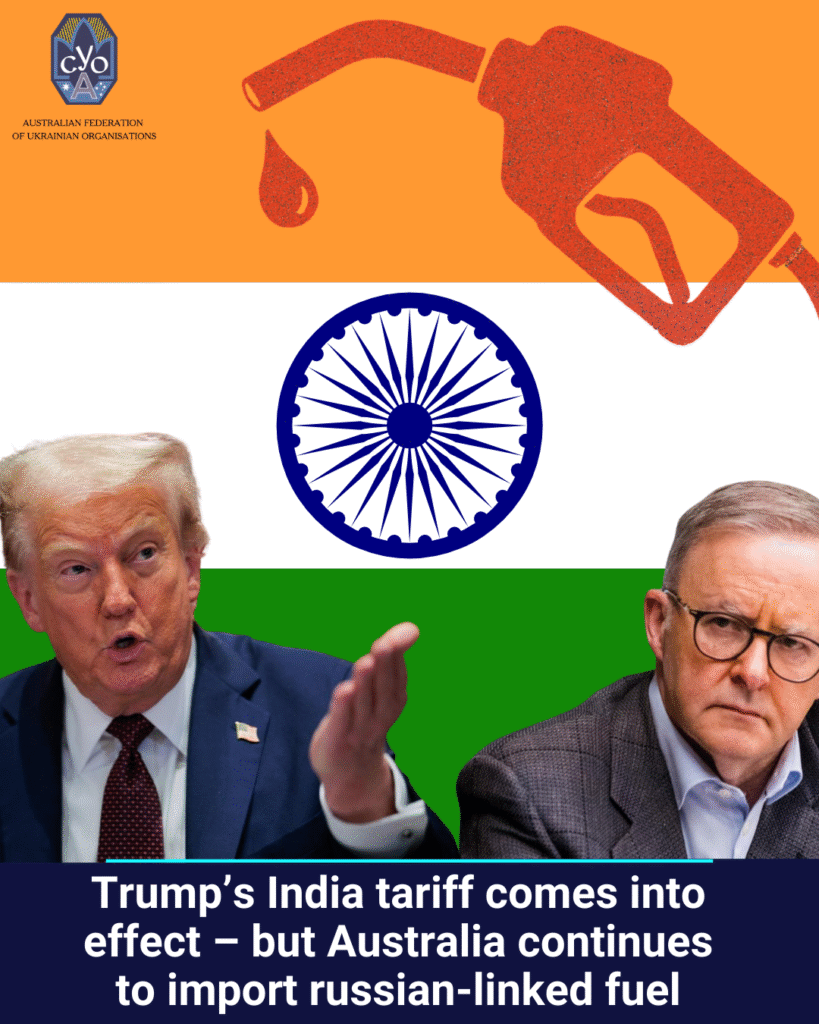The US has hit India with an extra 25% tariff for buying cheap russian oil and funding russia’s war against Ukraine – but Australia still allows fuel made from russian oil.
