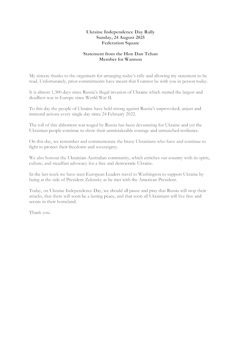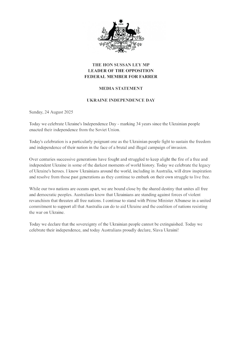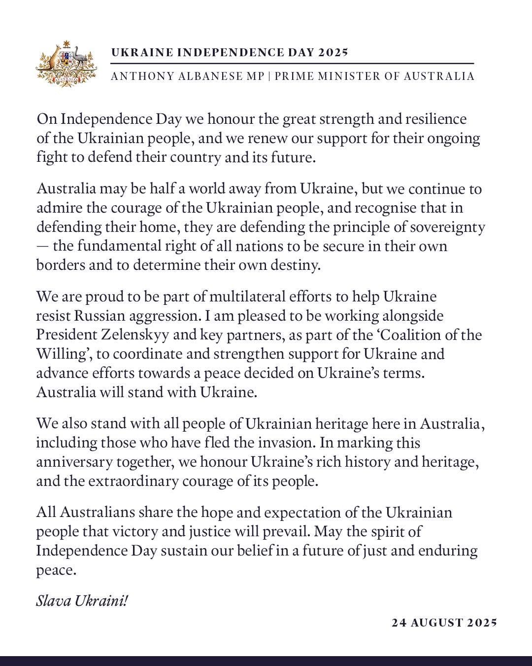 “Australia may be half a world away from Ukraine, but we continue to admire the courage of the Ukrainian people, and recognise that in defending their home, they are defending the principle of sovereignty,” reads Anthony Albanese’s address on 24 August 2025 to mark Ukraine’s 34th Independence Day.