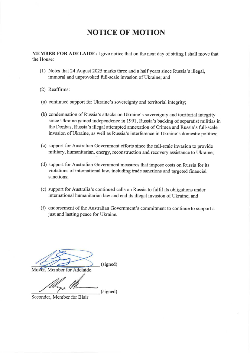 Steve Georganas MP moved a motion to mark three and a half years since russia’s full-scale invasion of Ukraine in the Federal Chamber, Parliament House.