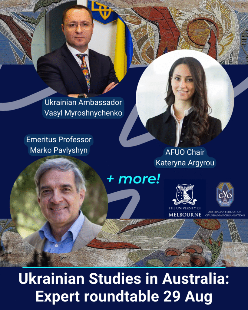 This Independence Day week, join AFUO Chair, Kateryna Argyrou, the Ukrainian Ambassador, HE Vasyl Myroshnychenko and leading academics for a symposium exploring the history and future of Ukrainian Studies in Australia.