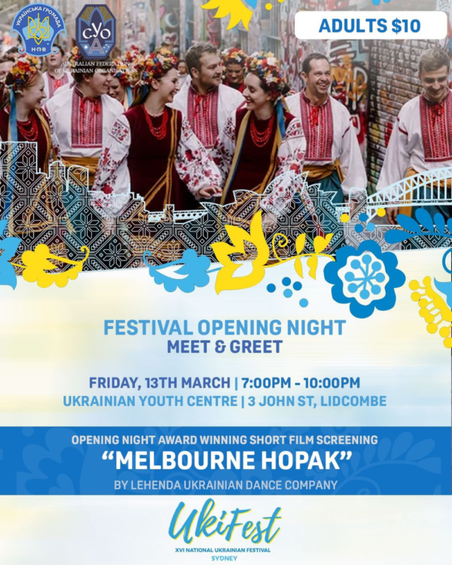 The festival opens at the Ukrainian Youth Centre with a Meet & Greet and the screening of Melbourne Hopak, celebrating the power of Ukrainian dance and the strength of our diaspora community.