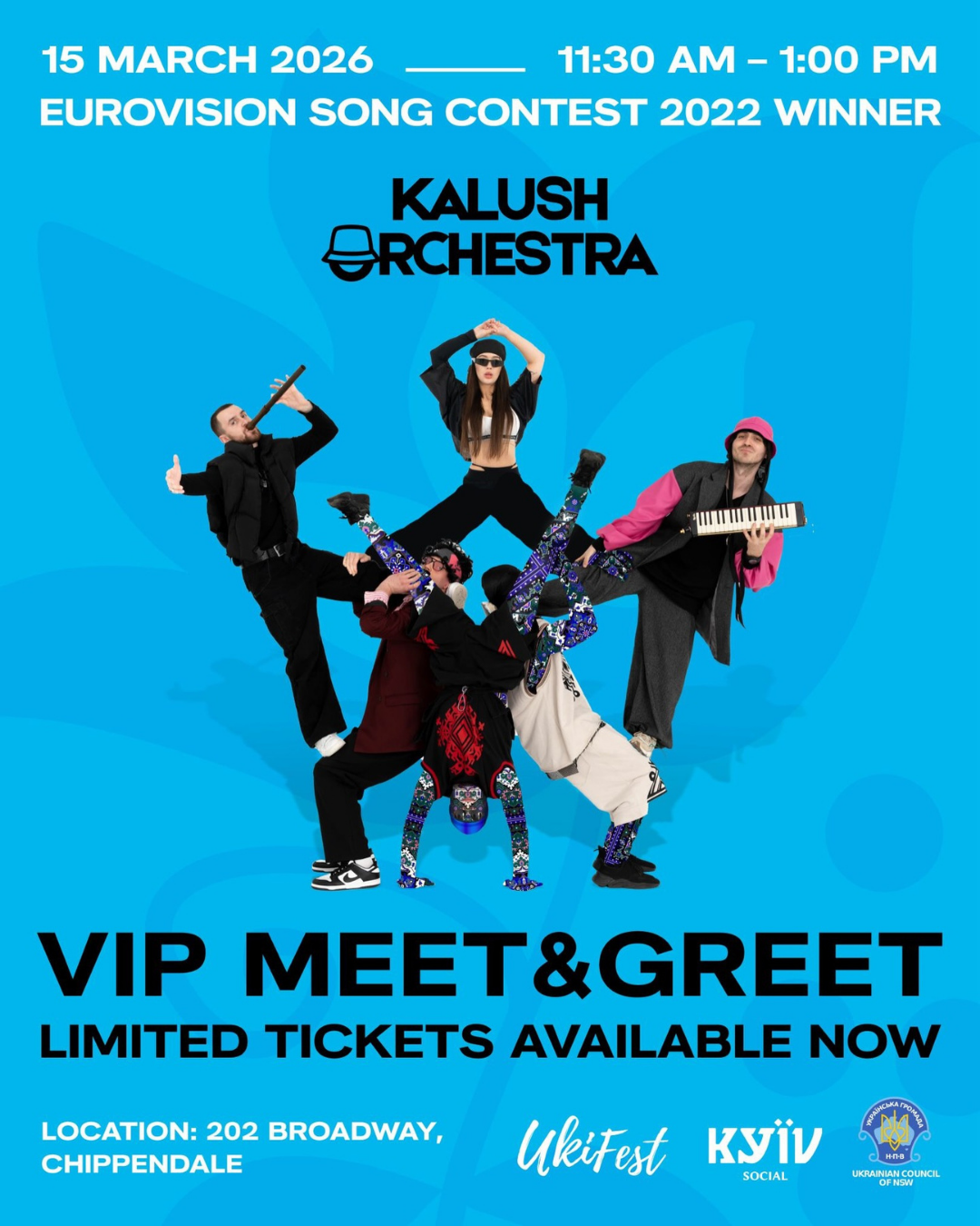11:30am-1:00pm VIP Meet & Greet with Kalush Orchestra at Kyiv Social – Kalush Orchestra – VIP Meet and Greet! Tickets: www.trybooking.com/events/landing/1547087